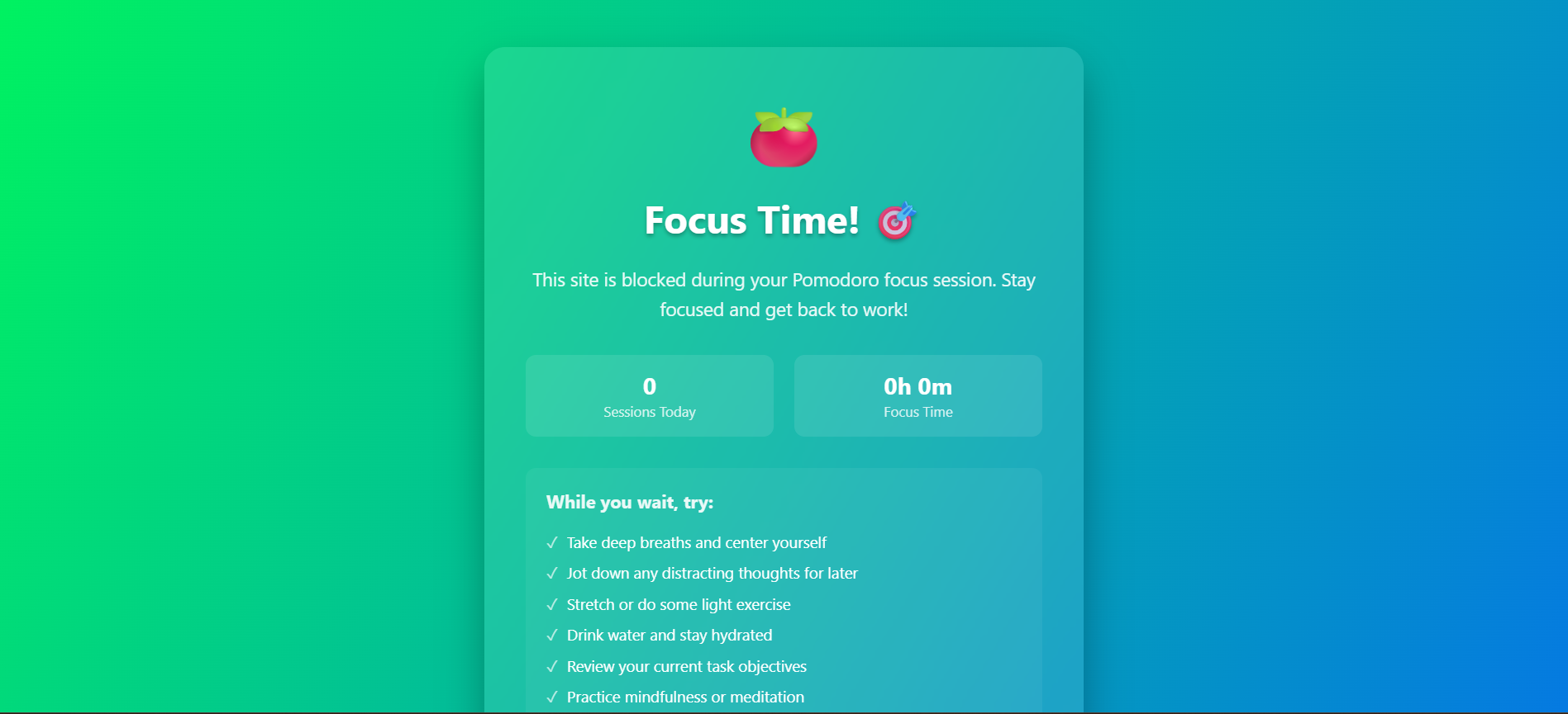 A classic Pomodoro timer web extension (e.g., 25 minutes of focus, 5 minutes break) that also blocks a user-defined list of distracting websites during the focus periods.